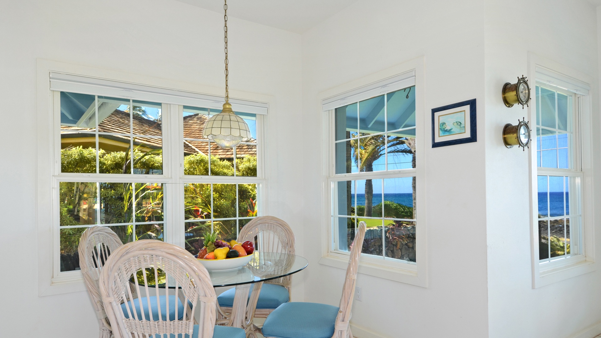 Beautiful ocean view from the porch!!!! Charming 2 bedroom, 2 bath with air conditioning in the master bedroom (set to 72 as the lowest). In the living room, kitchen and 2nd bedroom with 2 twin beds, we had screened windows open and fans going. Cute kitchen to cook meals of your own. Great Location in Poipu!