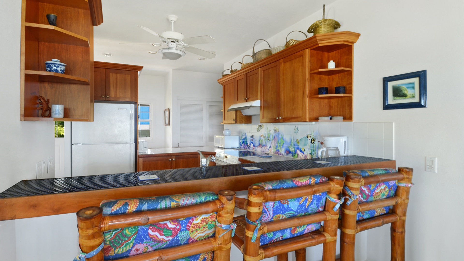 Fantastic location right across the street from the ocean. Loved sitting on the patio and watching turtles. short walk to one beach great for boogie boarding and another for snorkeling. House was comfortable and kitchen well stocked. We were worried about the downstairs bedroom not having air conditioning, but with the upper windows open, the ceiling fan on, and bringing in the fan from upstairs, our adult kids were comfortable. We left the master bedroom door (upstairs) open at night and ended up not even using the air conditioning in that room. We were very sad to leave. Not a ton of restaurants within walking distance, but was fine for us. Only suggestion would be for rental company to give more info prior to arrival... our flight on a Sunday was delayed and we didn\'t know if we would have the access code for the house on arrival (fortunately, they sent it to us before arrival). There was a welcome packet telling us where to park inside the house, but it would have been great to have that info before arrival. They were very communitive and helpful otherwise and those are very minor suggestions. We would LOVE to stay there again! It was exactly what we needed this year. Many people walking by actually took pictures of the house (I think to consider renting in the future).
