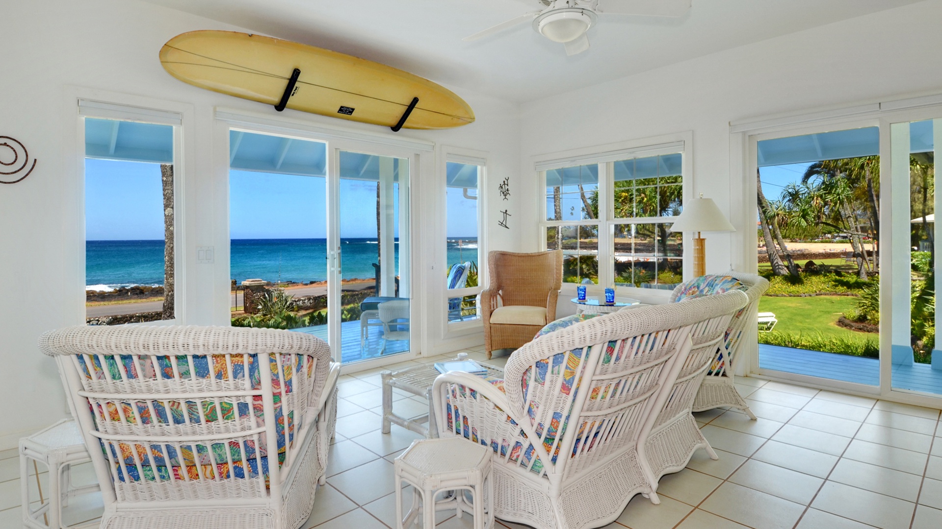 Our Kauai cottages include this one across from the world famous Brennecke Beach and steps from sunny Poipu Beach. Hale Kahakai Punahele (The House of the Cherished Seacoast) is arguably located in one of the best beach locations in Poipu. With its incredible unobstructed oceanfront views over a small lane fronting the beach and quaint island-style cottage furnishings, this continues to be one of our most popular Kauai vacation rentals.
