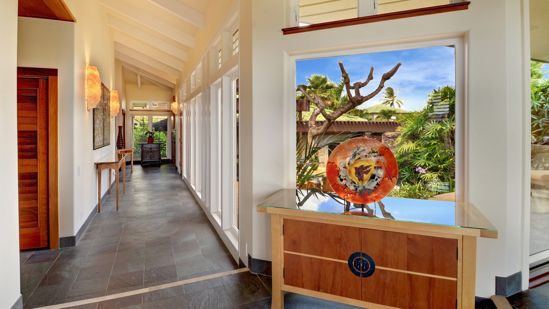 This luxury Kauai vacation rental is set on the coveted greenbelt in the center of Poipu Kai and overlooks Shipwreck Beach. Hale Maluhia at Poipu Kai blends indoor and outdoor elements into a unique island life experience with custom made furniture, local art and beautiful landscaping. Enclosed inside grand lava rock walls, this “House of Peace” offers three bedrooms, a private swimming pool, intimate courtyard with garden. Slightly elevated, the open architecture receives the trade winds and captures the sounds of the waves breaking nearby.
