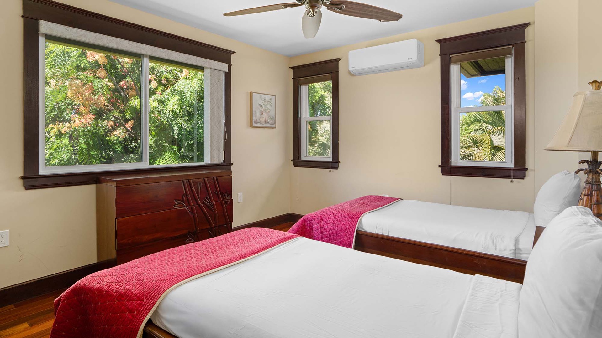 We had a nice stay at this home. It is large enough for our family of 8 people, was clean, had a well-stocked kitchen, and the management company was very good at communicating. The kids enjoyed the pool and backyard area. It's in a great location near Poipu and Kiahuna beaches, walking distance to CVS/Longs and shops and restaurants, and a quick 5 minute drive up to Koloa town. The only downside about this property is the lack of A/C made the bedrooms pretty warm, especially on the first night. We opened up the windows to get the breeze in as soon as we checked in, but it was still so warm inside. It was cooler outside at night than inside until about day 3. We knew it did not have A/C when booking but maybe adding a few more stand fans would be a good idea since the ceiling fans didn't help much due to the height of some of the tall ceilings. Otherwise, it was a great stay!