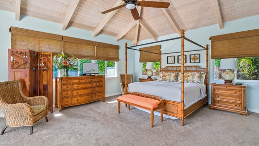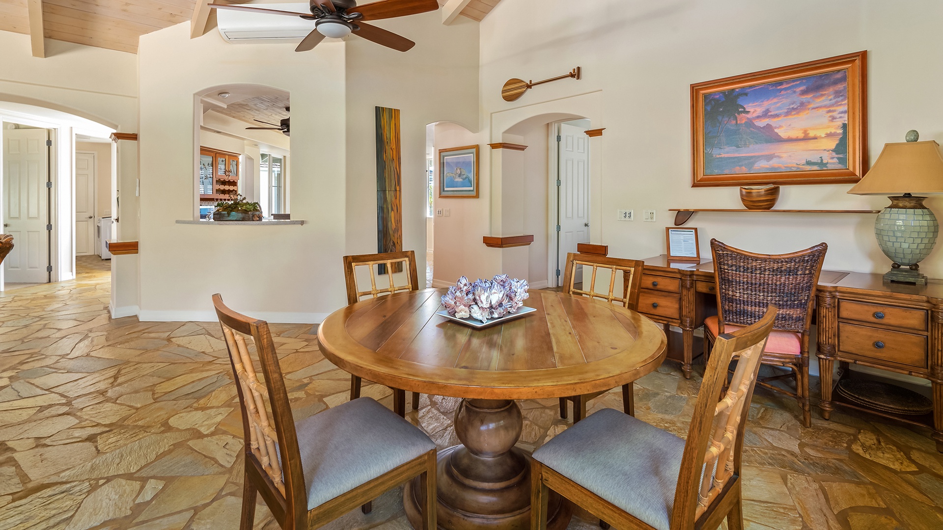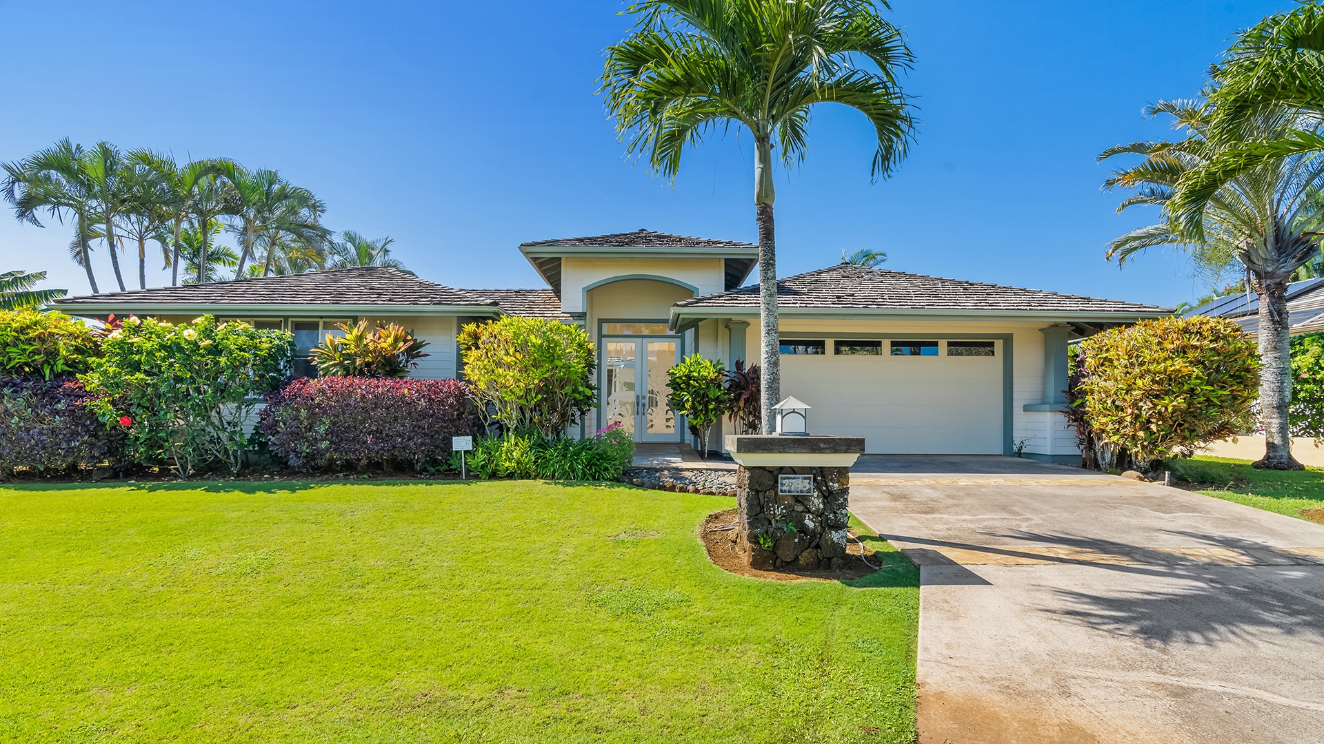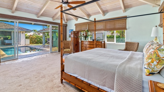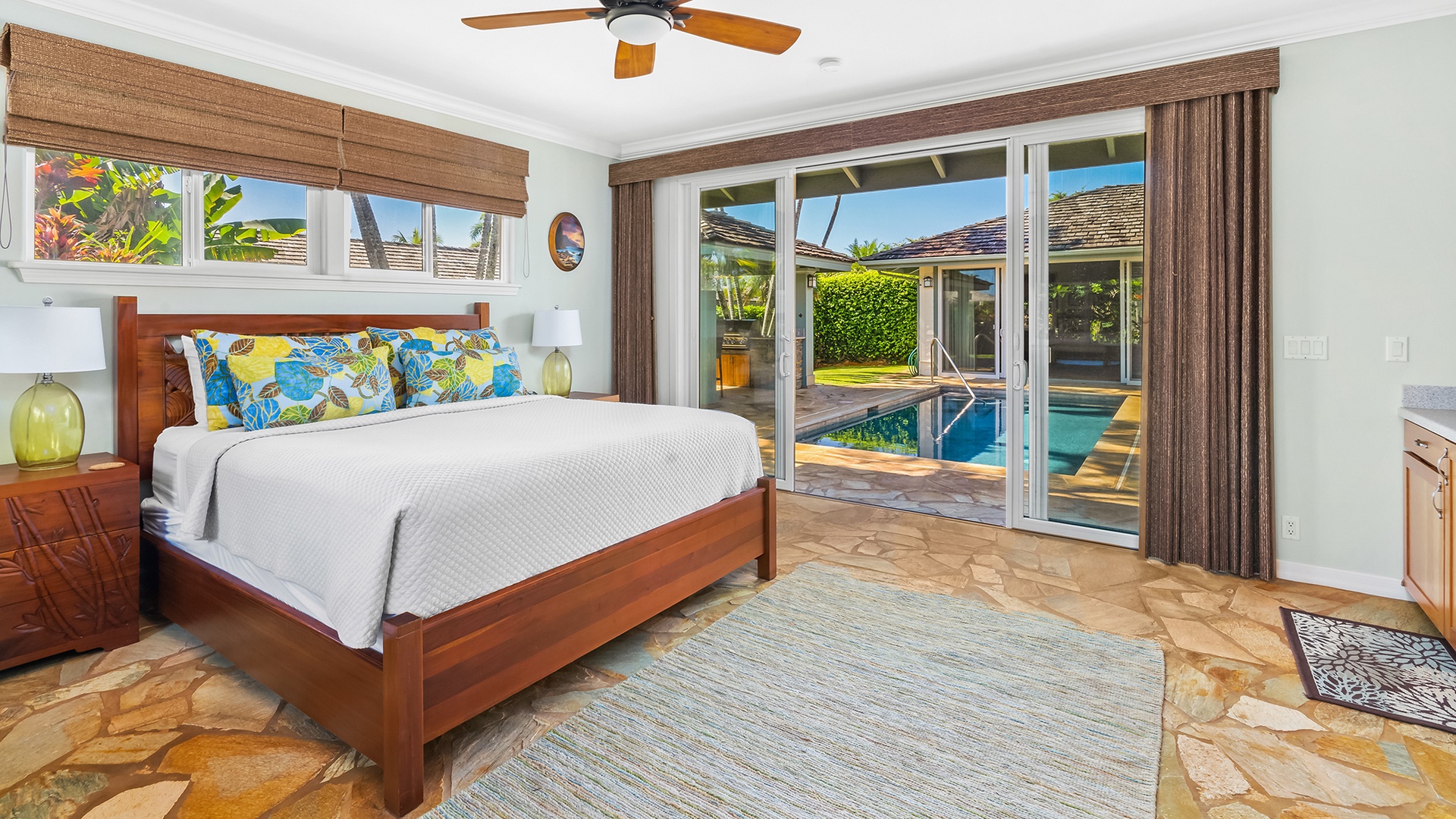 Kilohana at Poipu is a private tranquil vacation home nestled in the center of Kiahuna Golf Village and the Robert Trent Jones, Jr. golf course. This single-level home has a spacious indoor/outdoor living layout centered around a heated swimming pool and courtyard, perfect for entertaining. The main house offers one master suite along with a guest bedroom with air conditioning throughout. The attached ohana suite offers a second master bedroom also with Ac and direct access to the pool and courtyard.