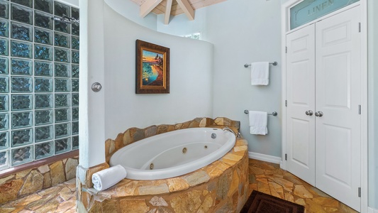 • Master Bedroom Suite – AC, king bed, TV, full bath with walk-in shower and separate jetted tub, access to pool deck