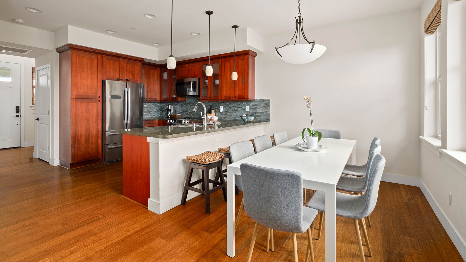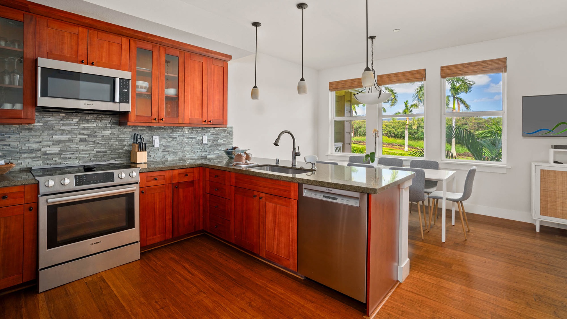 • Great room design – kitchen, dining and living room all with garden and distant mountain views, access to lanai